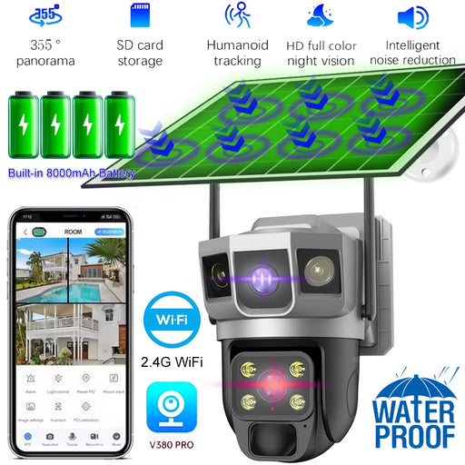 View full detailsSolar Outdoor Surveillance Camera Dual Lens Triple Monitoring Shots PIR Humanoid Detection Smart Home CCTV WiFi Security Cameras