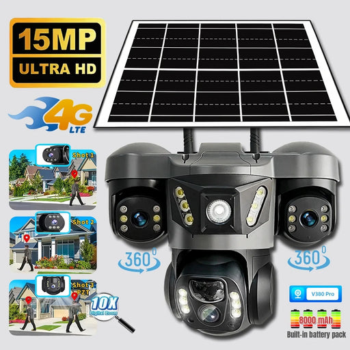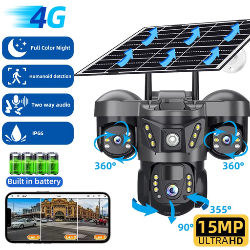 View full details15MP Triple Lens PTZ 10X Zoom Solar Camera Outdoor Triple Screen 4G SIM Secure 360° Auto Tracking Smart Home Wireless CCTV Cam