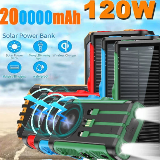 View full details200000mAh 120W Solar Power Bank With Led Lamp Super Fast Charging Ultra High Capacity 4 Wire Digital Display External Battery